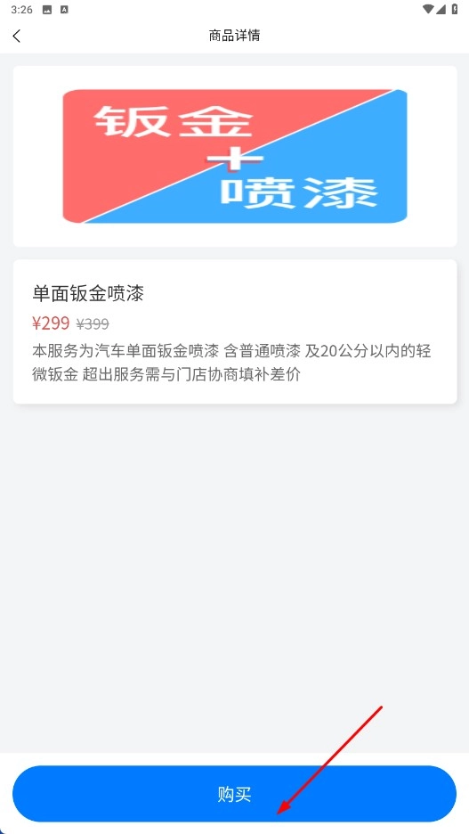 在商品详情页面,您可以查看钣金喷漆服务的具体信息,点击【购买】功能按钮即可完成购买操作。