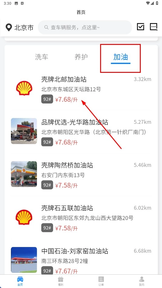 点击【加油-分类标签】,能够查看周边加油站及其油价信息,挑选合适的加油站后即可开展加油相关操作。