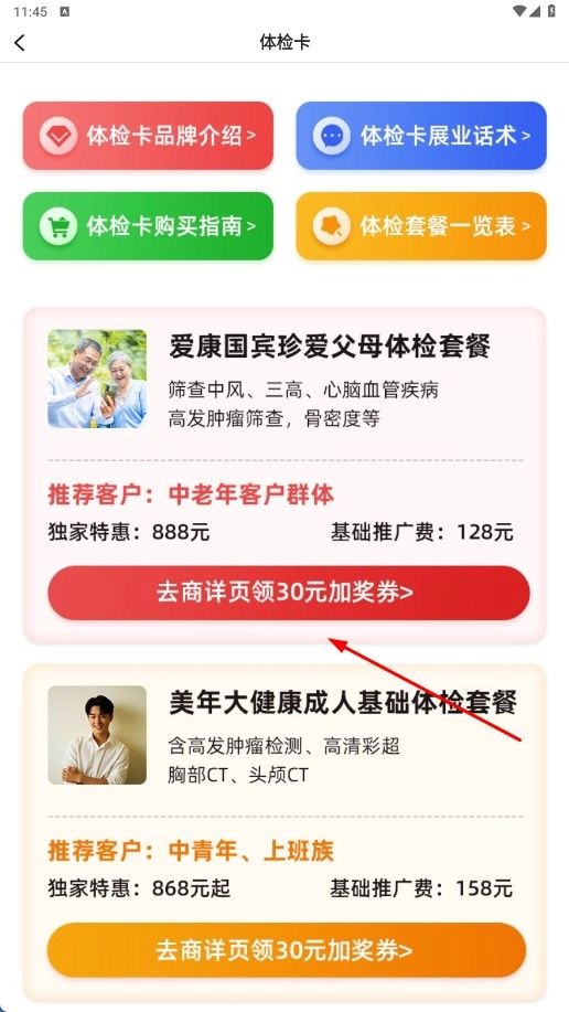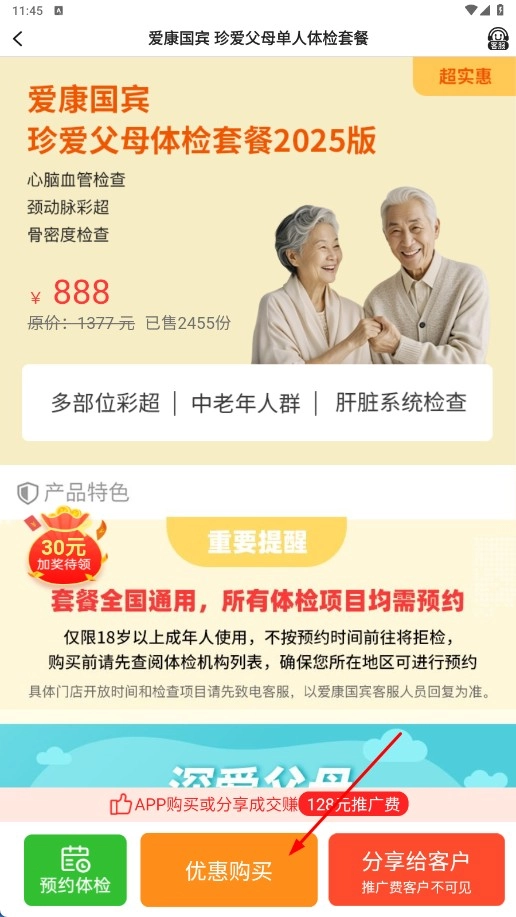 领取优惠券后,您可以点击【优惠购买】功能按钮,完成体检套餐的优惠购买流程。