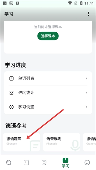 打开德语学习软件的首页后,点击底部的【学习】图标,就能进入学习页面,在该页面可以查看学习进度,也能使用德语参考功能。