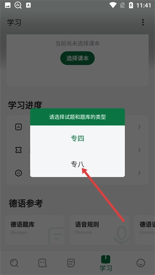 在学习页面找到【德语题库】并点击,此时会弹出题库类型选择框,接下来就可以准备选择考试类型了。