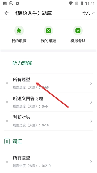 在专八题库页面,点击【听力理解】板块下的【所有题型】选项,即可开启听力题型的刷题训练。