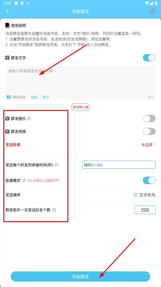 在主界面,点击【消息群发】功能图标,即可进入消息群发设置页面。