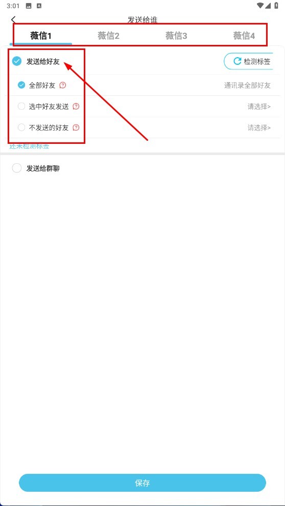 在发送对象选择页面,选定微信账号以及发送好友的范围后,点击【保存按钮】即可完成相关设置。
