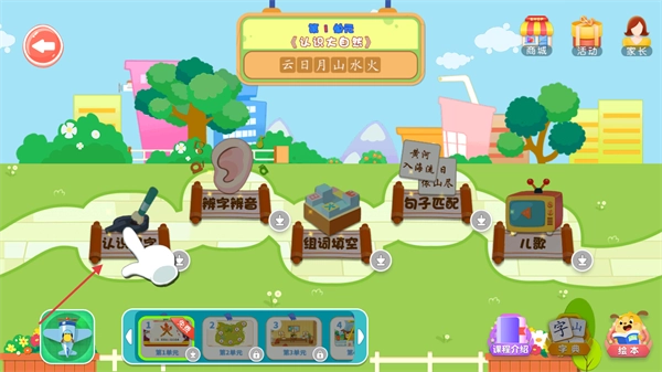 在认字基地的学习界面中,点击【认识字】这一选项,就能进入具体的认字课程进行学习。