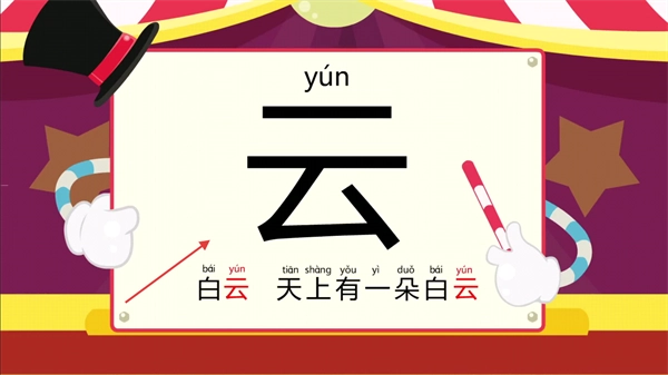 在学习认字的过程中,会呈现汉字“云”的读音、组词以及例句,借助这些内容就能学会该字的使用方法。