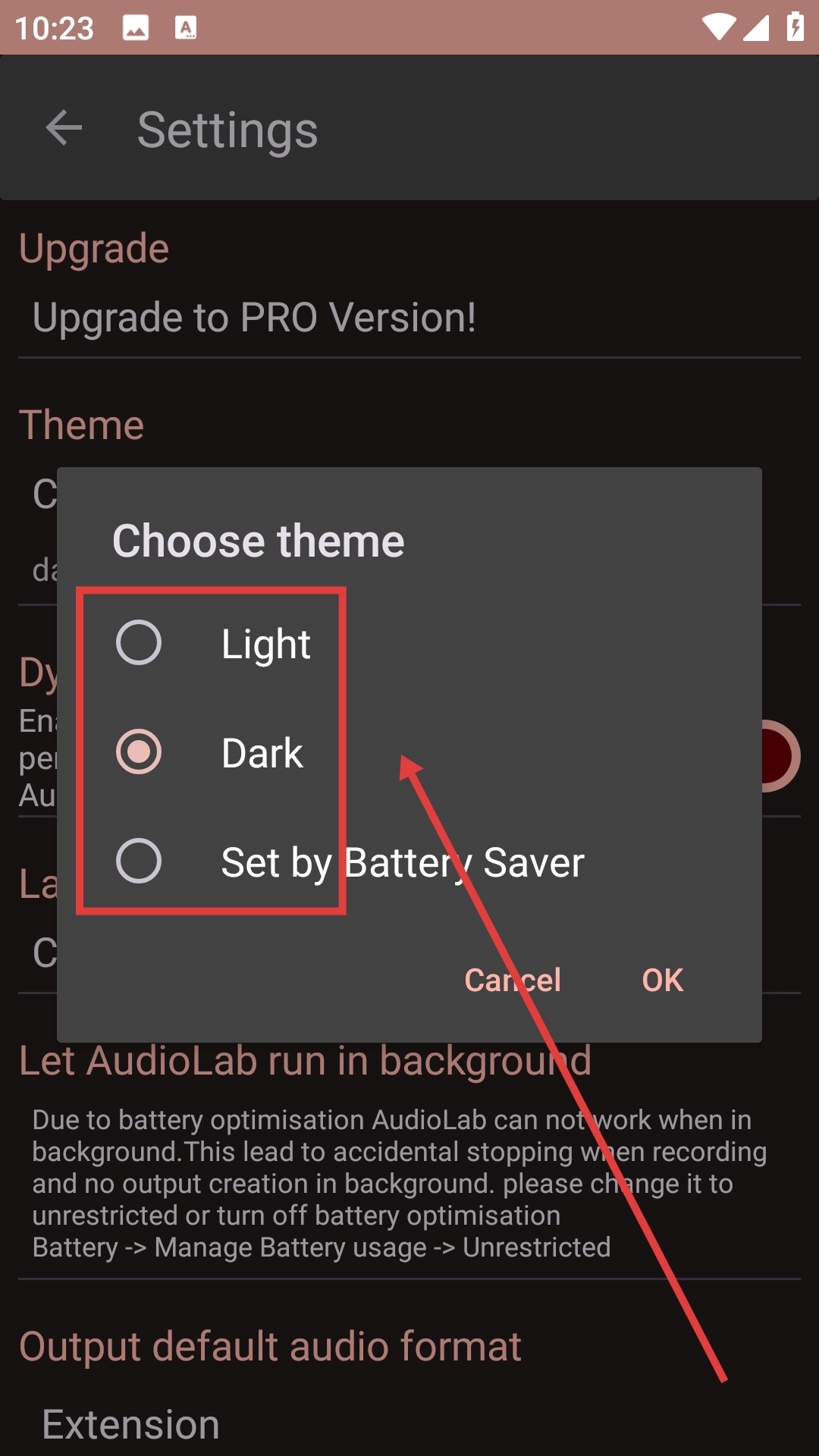 在主题选择弹窗里,能够选择【Light】【Dark】【Set-by-Battery-Saver】这几个主题,选好之后点击【OK】按钮来确认完成设置。