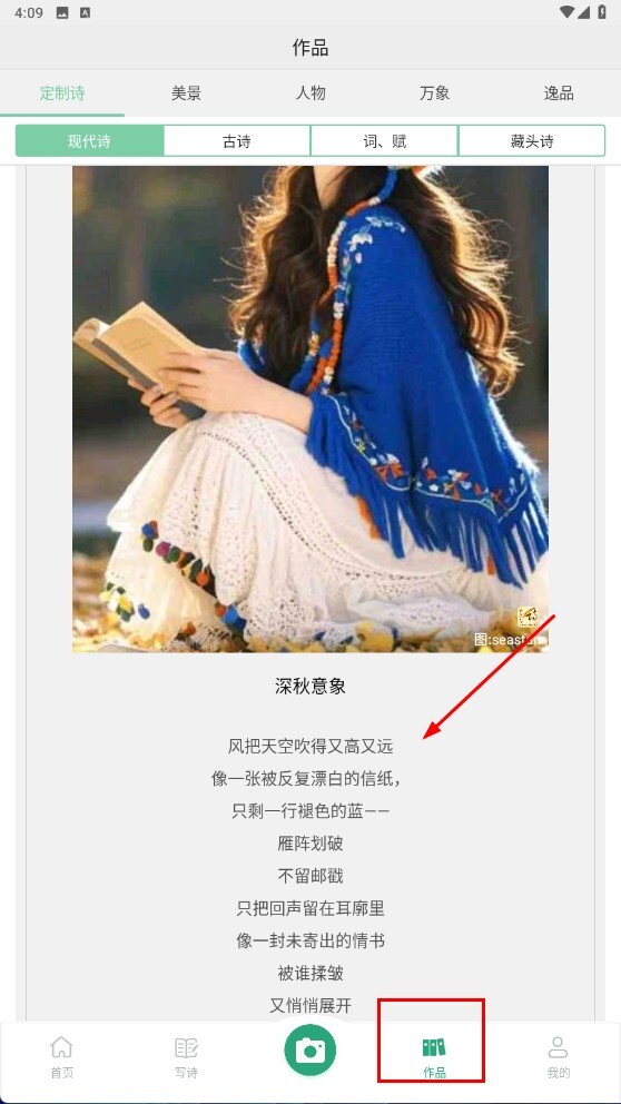 点击底部的【作品-功能按钮】,就能查看该作品对应的配诗词啦。