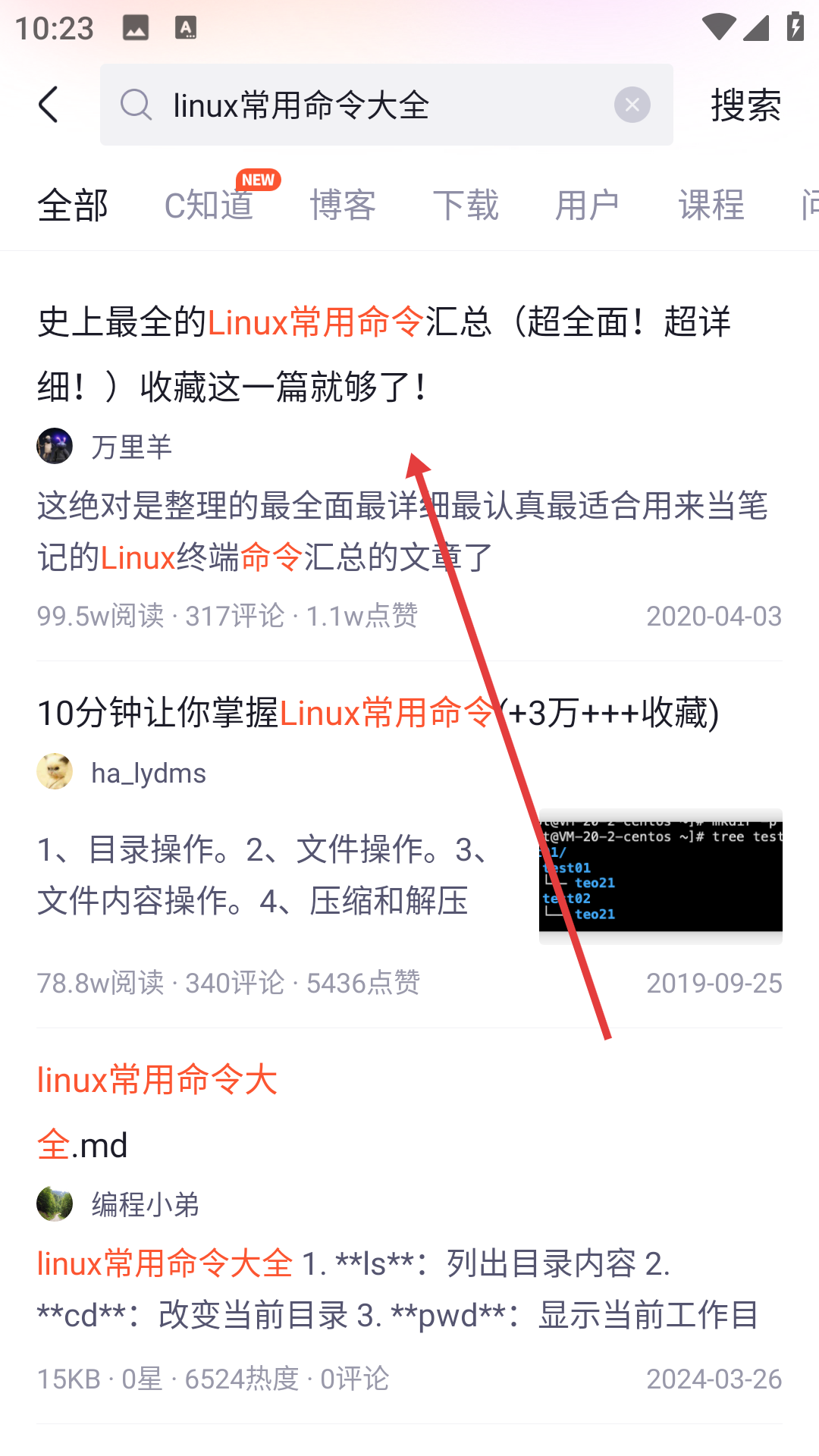 在搜索结果页面找到目标文章,比如《史上最全的Linux常用命令汇总》,点击后即可进入文章详情页。