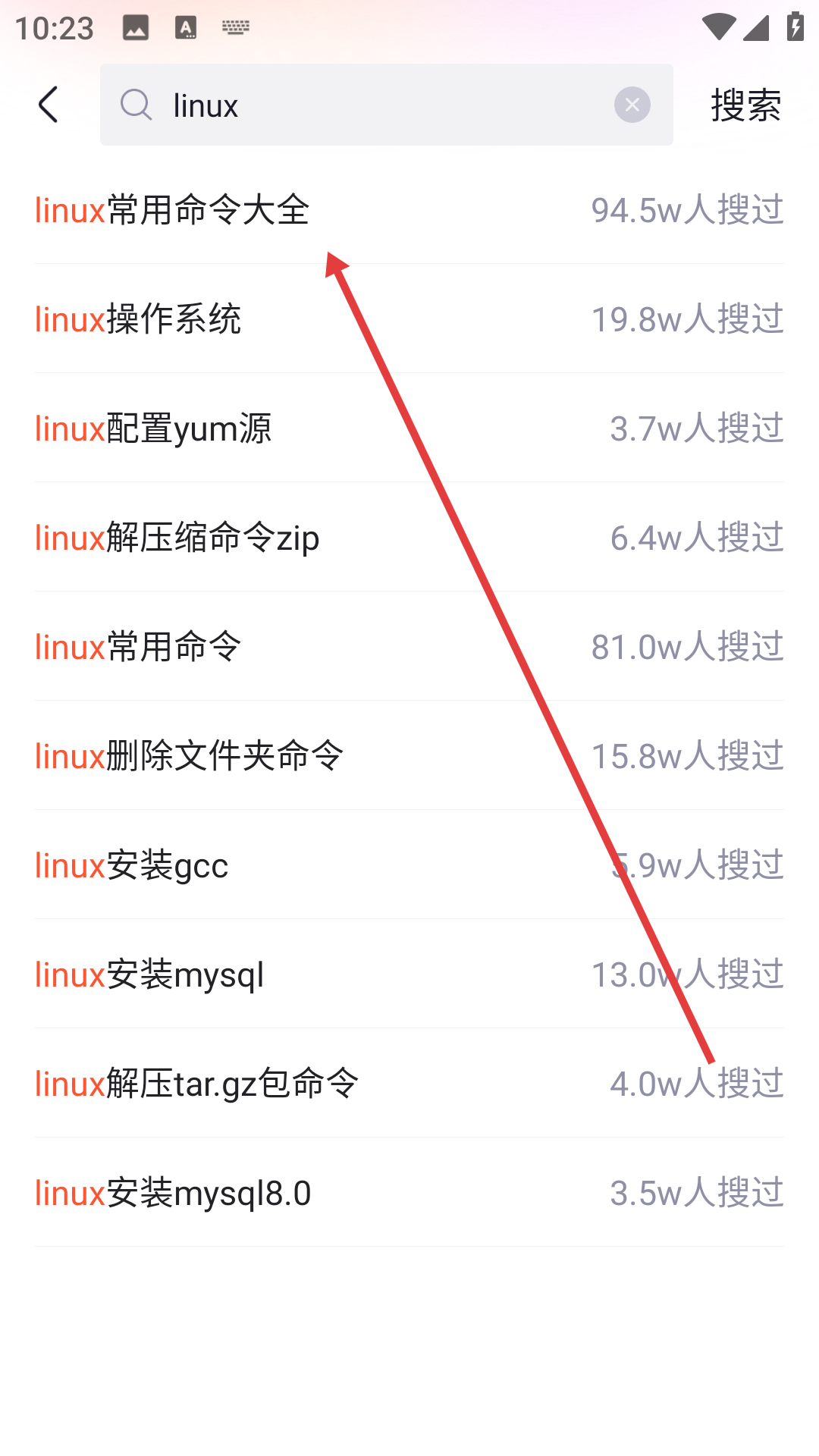 从搜索建议列表里挑选你想找的内容,比如“linux常用命令大全”,就能进入对应的搜索结果页面。