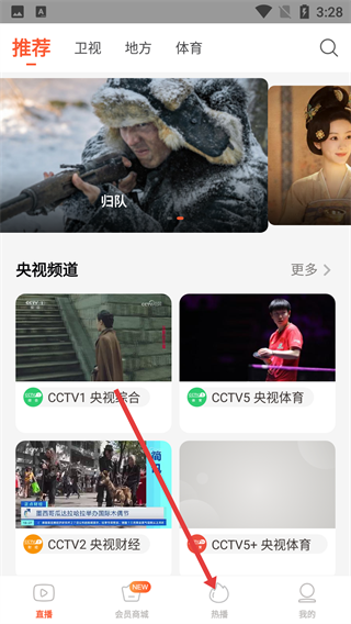 在视频应用的首页,点击底部的【热播】按钮,就能进入热播板块浏览各个频道的节目内容。