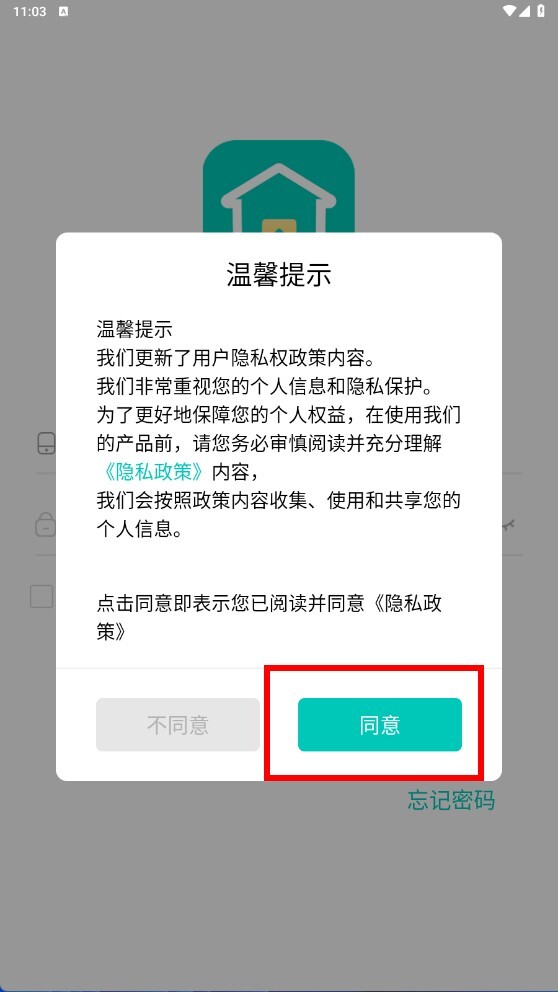 在温馨提示页面,点击【同意】功能按钮,即可进入登录页面。