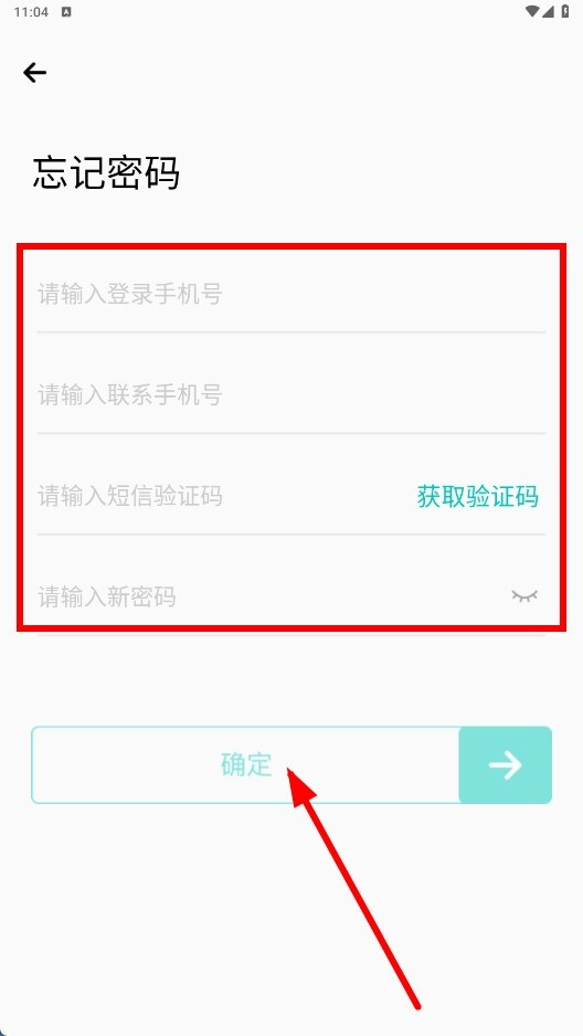 在忘记密码页面依次填写手机号、联系手机号、验证码和新密码,随后点击【确定】功能按钮,即可完成密码重置操作。