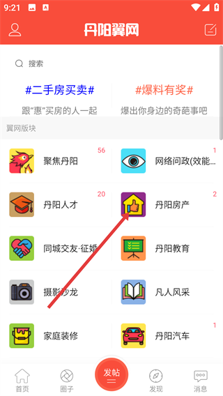 在论坛页面里,找到【丹阳房产】这个板块并点击它,就能进入到房产信息专区了。