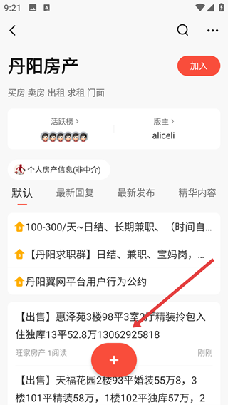 在【丹阳房产】页面,点击红色的【+】按钮,就能发布房产买卖、租赁之类的信息。