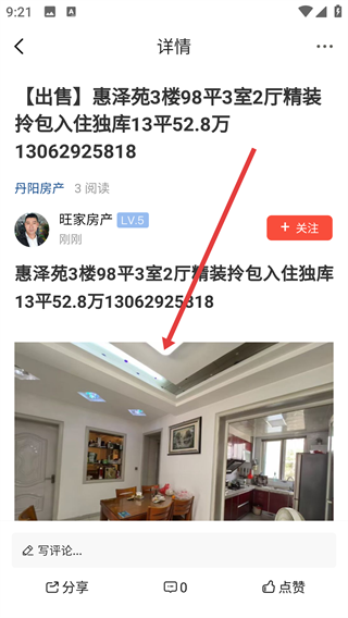 点击房产信息条目后,进入详情页面就能查看房屋图片、价格、联系方式等具体内容。