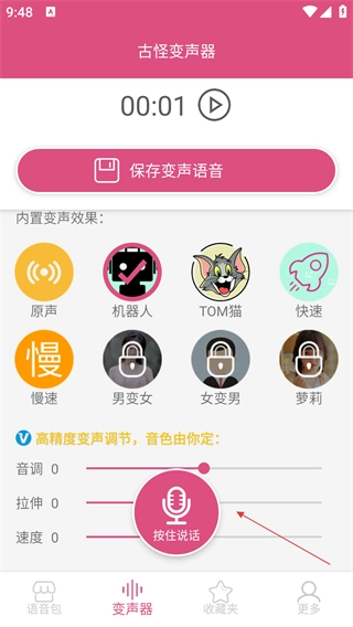挑选想要的变声效果(比如【机器人】),按住【按住说话】按键录制语音。