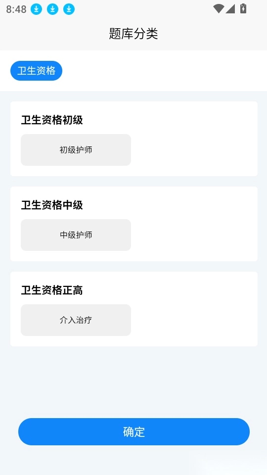 之后在题库分类里就能挑选需要备考的题库,点击“确定”按钮进入下一步操作。