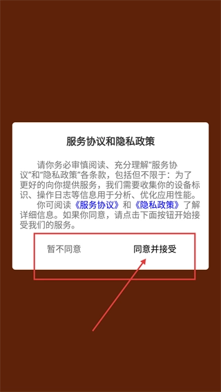 要进入【服务协议和隐私政策】页面,需先阅读相关条款,若同意条款内容,点击【同意并接受】按钮后,方可继续使用服务。