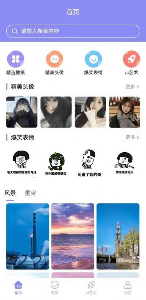 2、在首页中,可以看到一精美壁纸、精美头像、爆笑标签、ai艺术等等的选项。