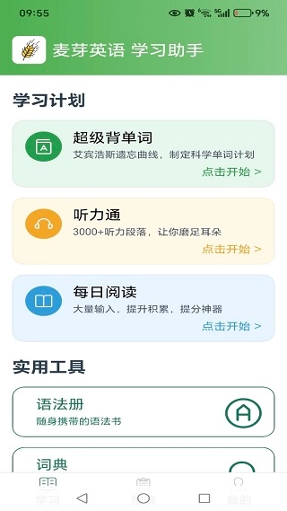 首页设有学习计划与实用工具两大板块,可便捷进入单词背诵功能。