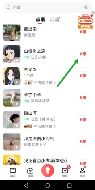 用户进入点歌页面后,挑选自己想参与合唱的歌曲,接着点击歌曲旁的【K歌】按钮。