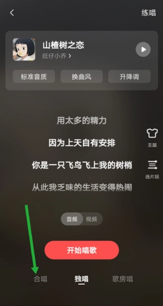 在新打开的页面里,点击底部那个标有【合唱】的按钮,它就在下图绿色箭头所指向的位置。