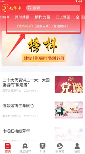启动应用后,可在首页上方的专区里,根据需求查找榜样力量等相关栏目。