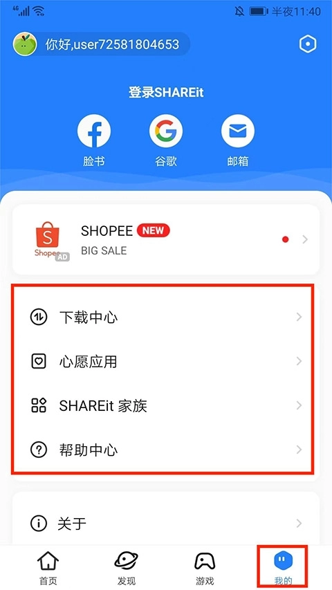 打开SHAREit Premium,进入应用主界面后,能看到首页、发现、游戏和我的这四大栏目。