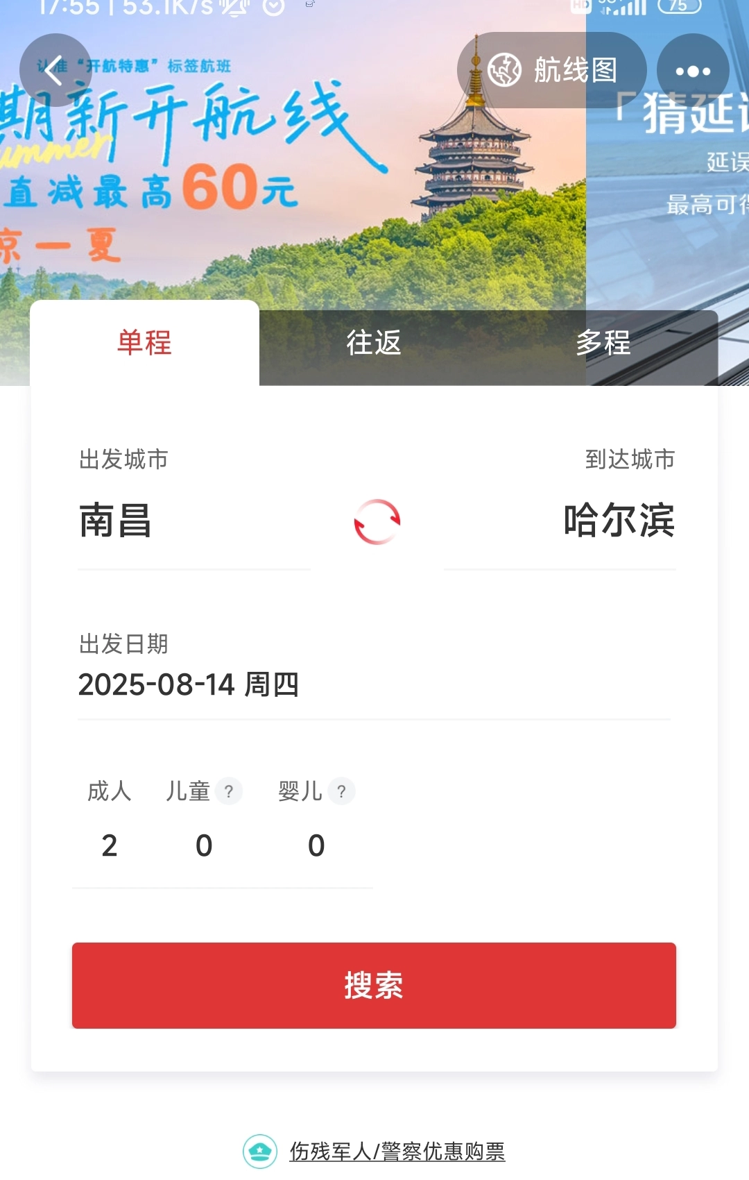 选择出发地点,日期还有人数,点击下方【搜索】