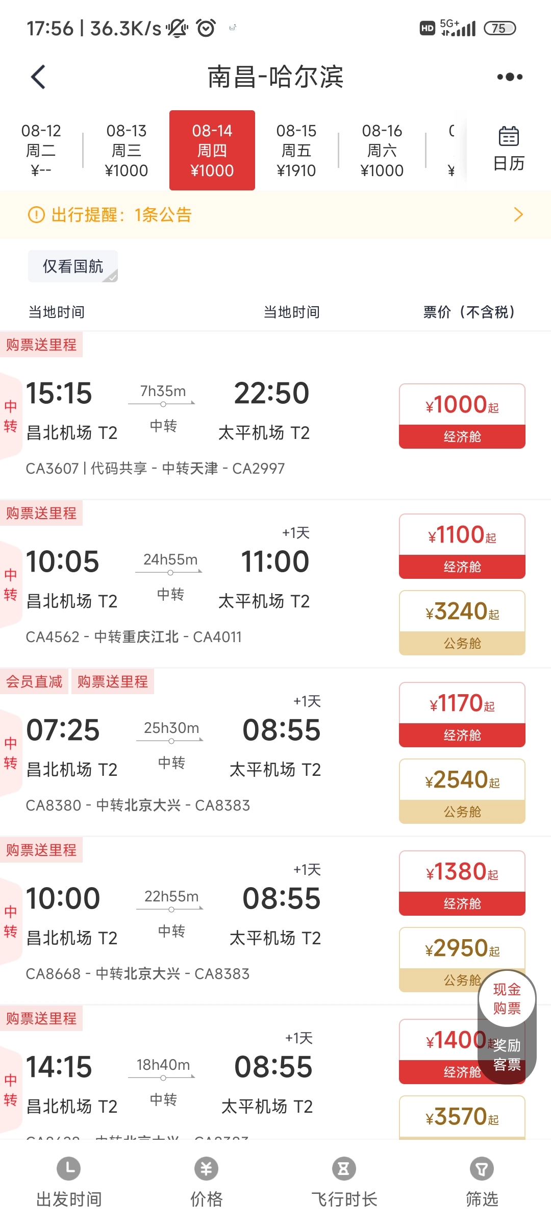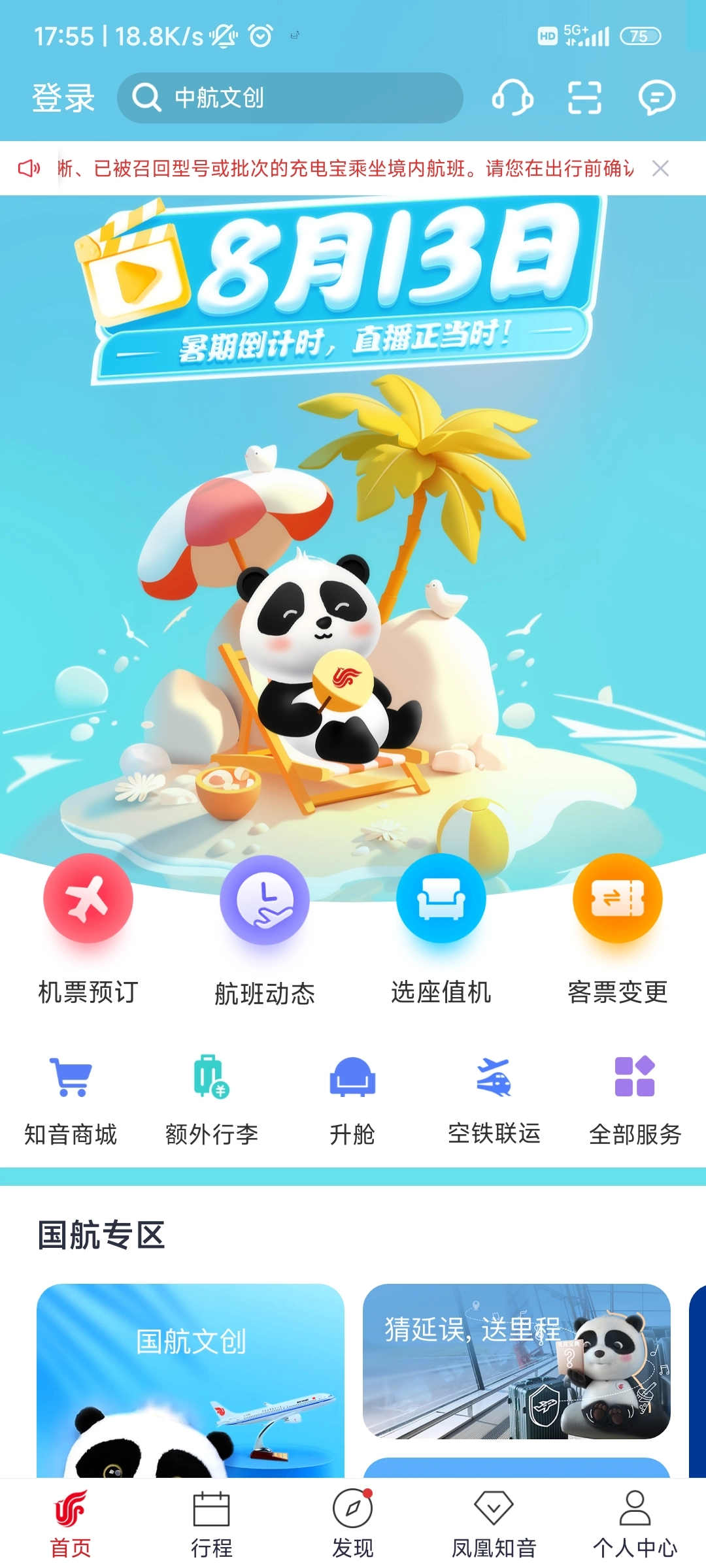 打开中国国航,点击【机票预定】