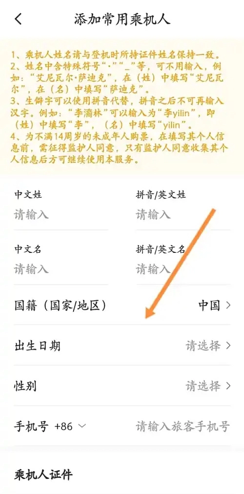打开中国国航应用,点击界面右下角的【个人中心】,接着点击【常用信息】选项,页面跳转后,点击新页面上的【+】图标。