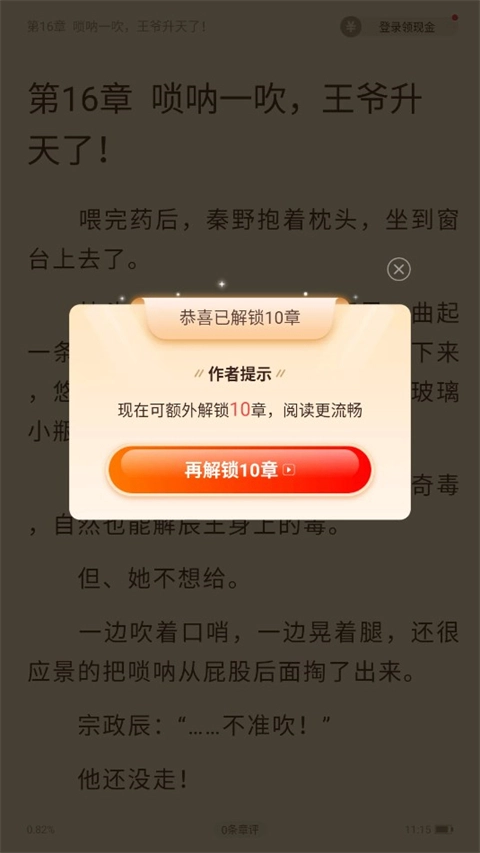 2、观看广告后可解锁10章内容,若想解锁更多,可继续观看广告或开通会员。