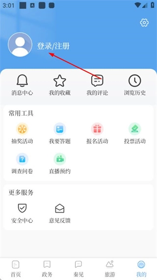 在个人信息页面点击顶部的注册登录按钮,即可进入登录界面。