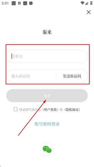 在登录界面依次输入手机号与验证码,勾选相关协议后点击登录按钮,即可完成登录流程