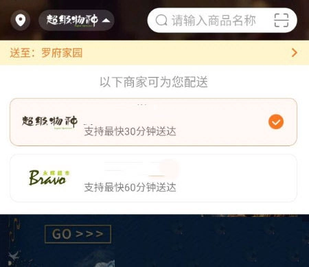 接下来我们可以先完成自身位置的定位,也能手动输入具体位置;等这一步完成后,就能在页面下方挑选支持配送的门店了。