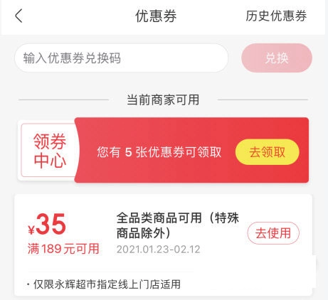 领取完成后我们可在优惠券管理界面进行查看。