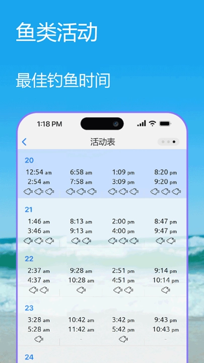 3、鱼类活动:每小时活动图表和日月共同作用时段,每天最佳捕鱼时刻。