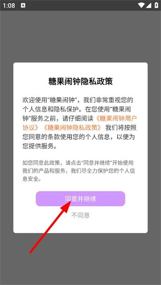在糖果闹钟的隐私政策弹窗里点击同意后,就能进入应用的主界面。
