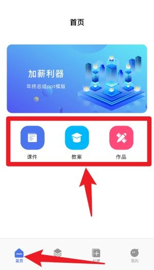 用户可在首页快速进入课件、教案、作品模块,便于分类浏览和查找教育类PPT资源。