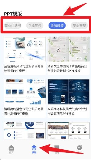 在模板页面里,能依据商业计划书、企业宣传、金融融资这类标签,迅速查找浏览对应的模板资源。
