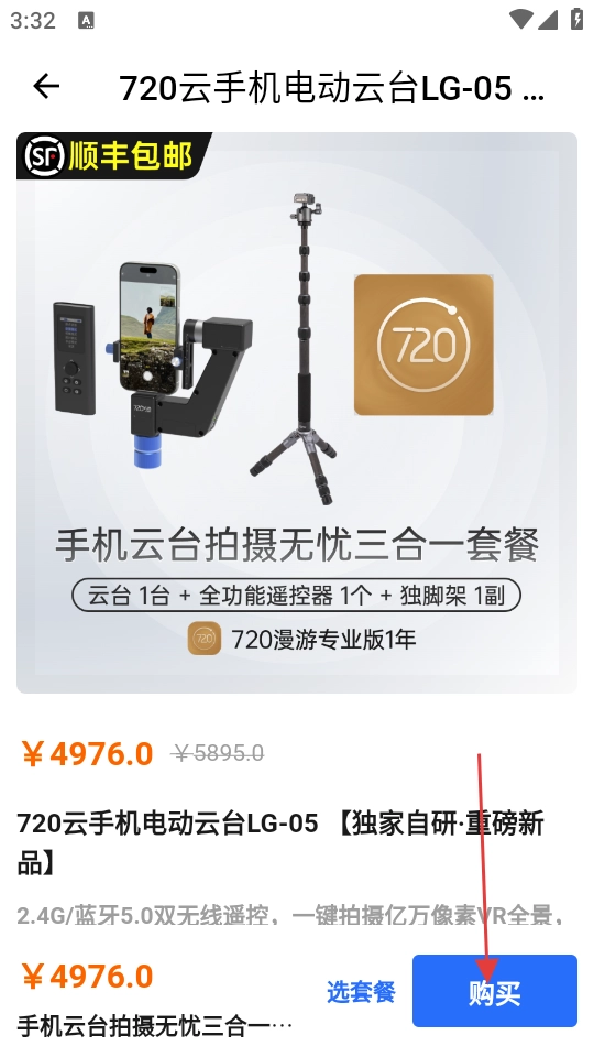 在设备详情页面,既能查看【手机云台拍摄无忧三合一套餐】的相关信息,点击【购买】按钮还能直接开展购买操作。