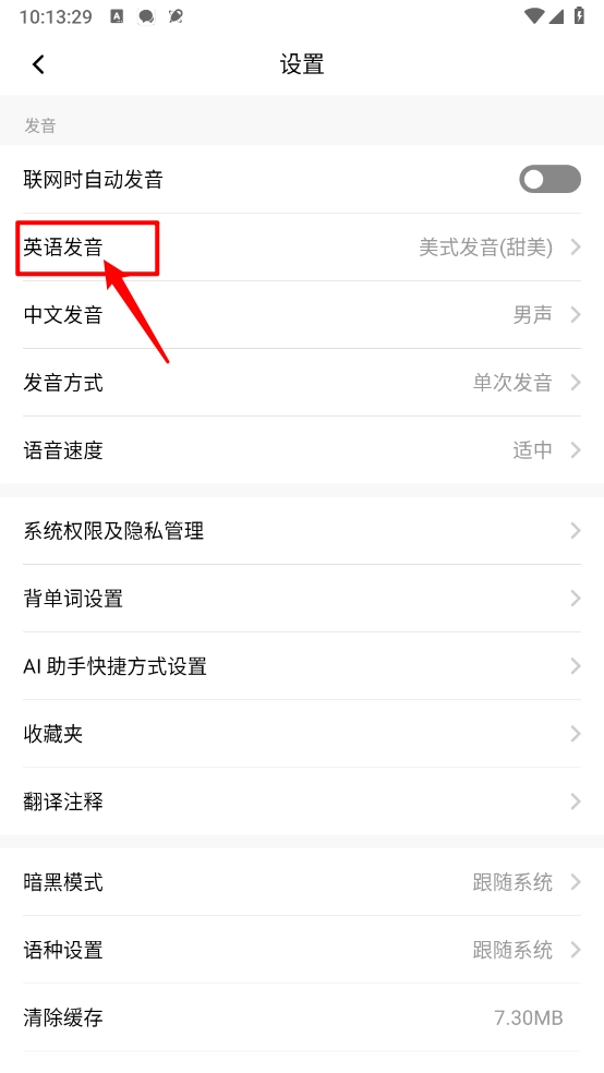 在设置页面点击"英语发音"。