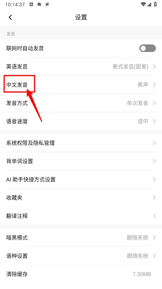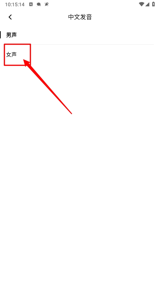默认是男声,进入设置页面点击"中文发音"。