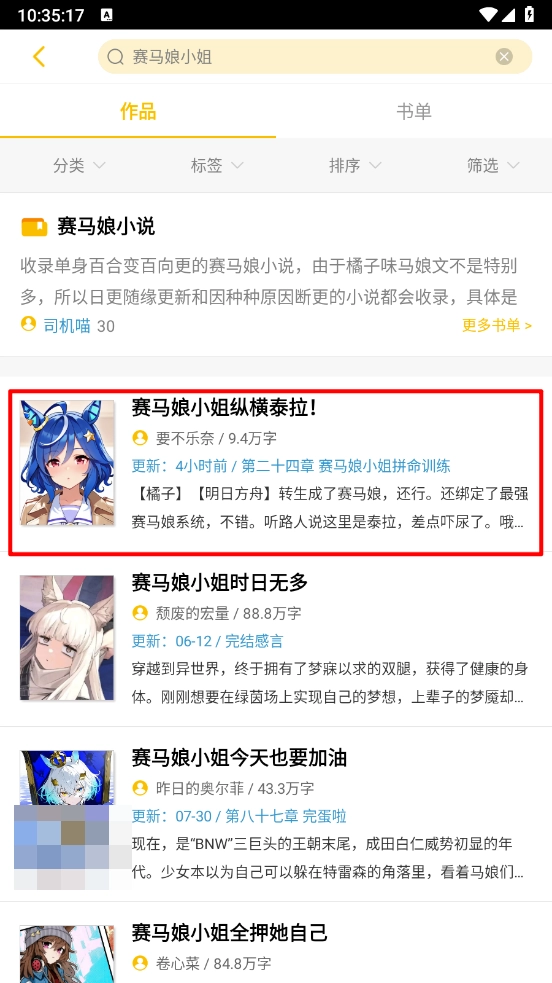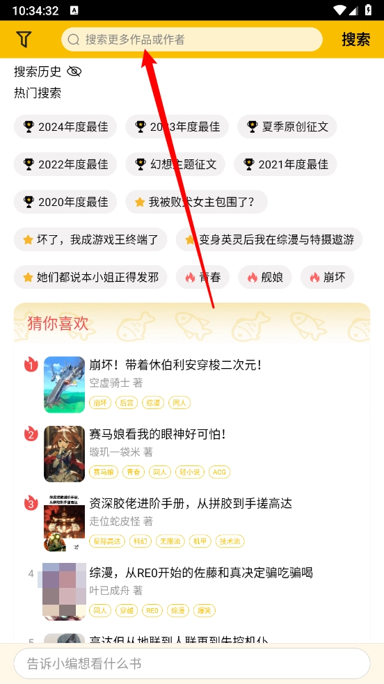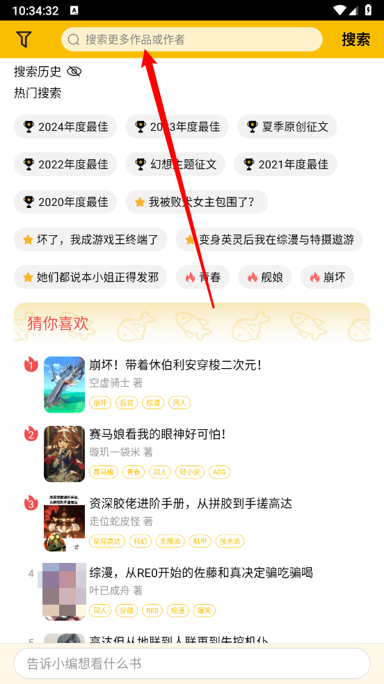 如图,输入作品名或关键字进行搜索小说资源。