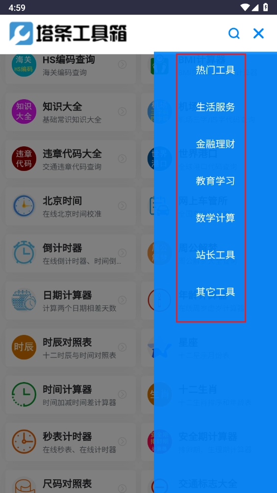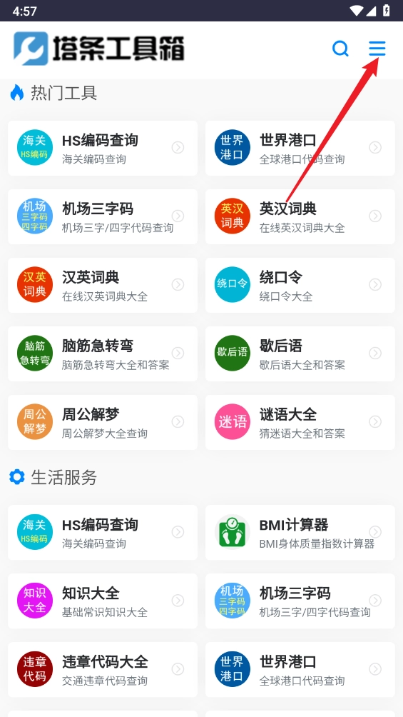 打开塔条工具箱,进入主页,点击右上角的三条横杠。