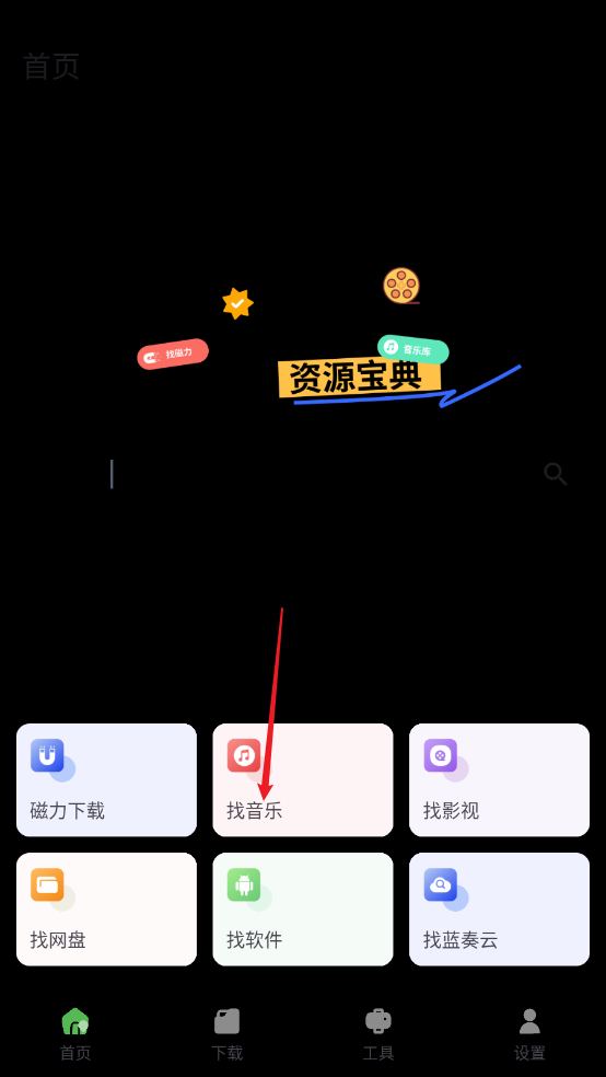 先在本站安装软件,进入主页,点击"找音乐"。