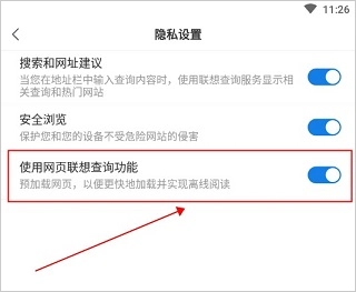 在“隐私设置”窗口里,找到并选择“使用网页联想查询功能”这一栏目。