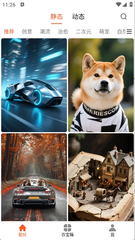 进入首页后,能看到多种类型的壁纸,包括创意类、萌宠类和二次元类等。