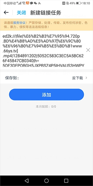 这里输入的是电驴链接,输入完成后选择保存位置,然后点击【添加】按钮就能启动。